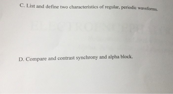 Compare and contrast synchrony and alpha block. Compare and contrast synchrony and alpha block. C List and define two characteristics of regular periodic waveforms.