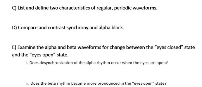 D Compare And Contrast Synchrony And Alpha Block. Biopac Student Lab 4. List and define two characteristics of regular periodic waveforms.